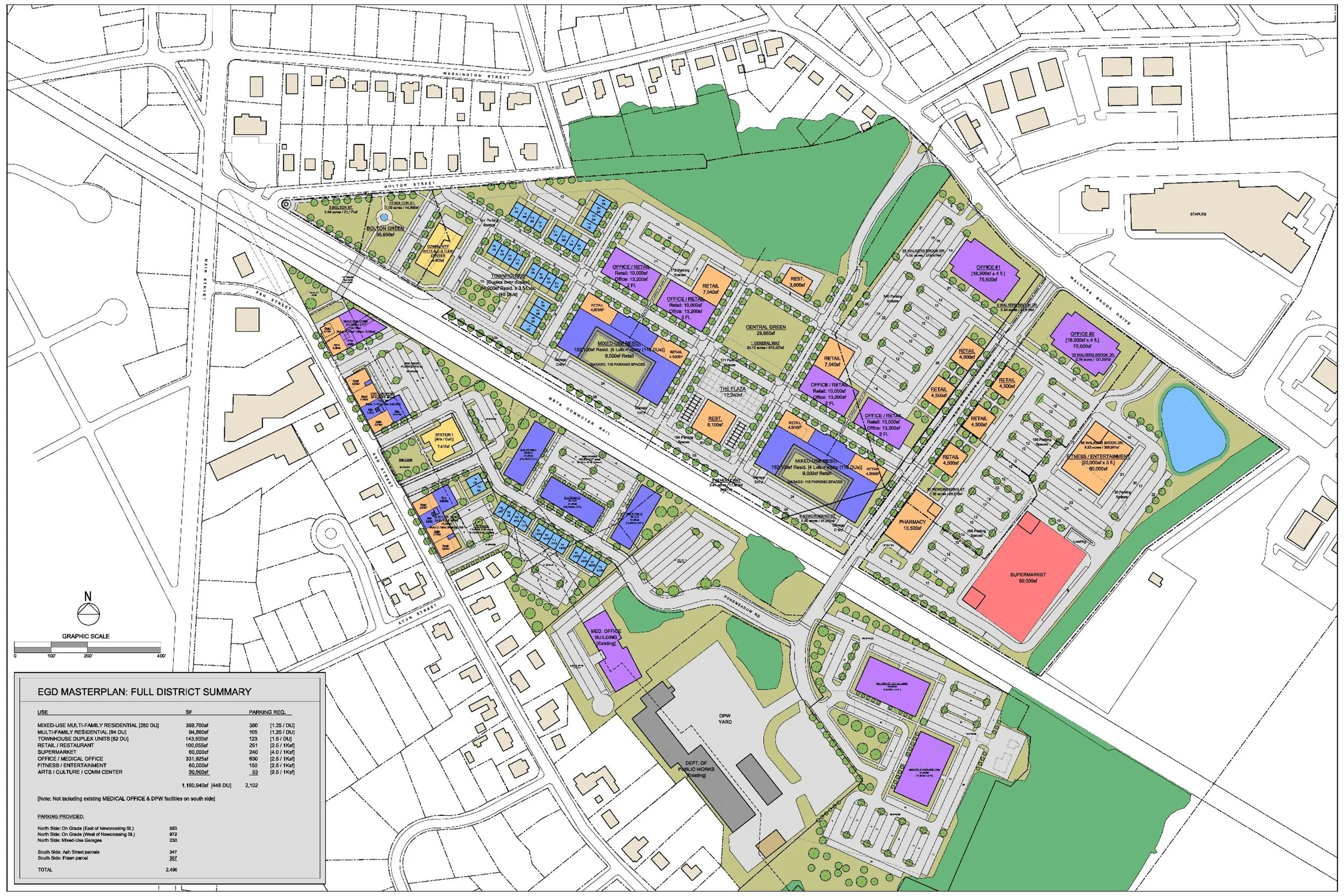Form + Place’s community master-planning expertise has also been put to use in 2025-2026 in the Eastern Gateway District in Reading, MA. Building on feedback from an initial Open House event in late 2024, Form + Place began a series of analytical “test fits” on the 68-acre industrially-zoned site along the MBTA commuter rail line between Route 128 and Reading’s village center. Reading’s Eastern Gateway District has been the subject of numerous studies in recent years and, as such, Form + Place’s efforts were intended to coalesce previous findings with current stakeholder feedback to produce an updated vision for the district. A clear framework emerged that emphasized a desire for higher intensity mixed-use development and diverse housing opportunities that would help expand the Town’s tax base, while incorporating publicly accessible open space and walkable streetscapes, designed to knit together surrounding neighborhoods.