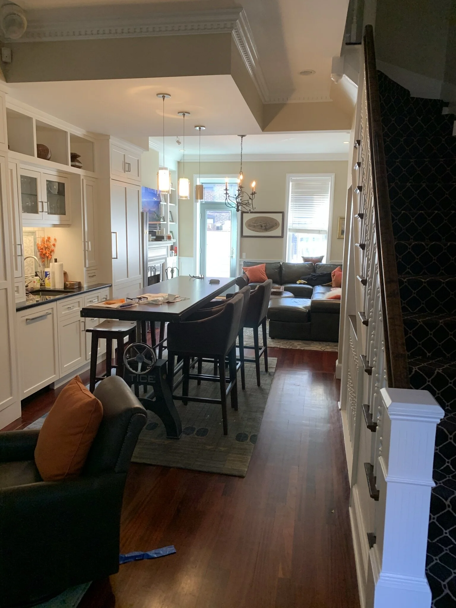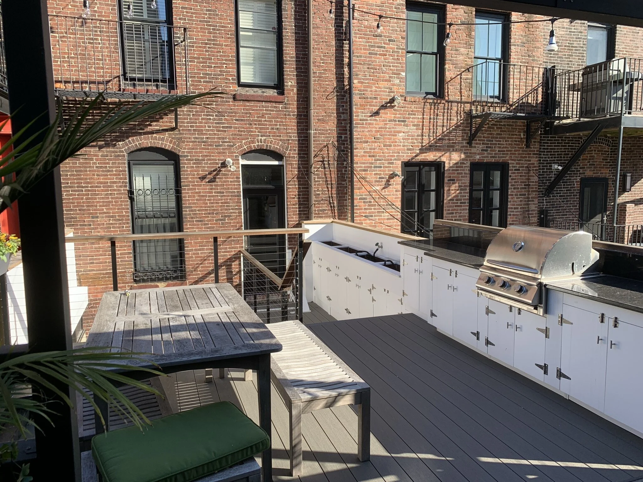Renovations to this stunning South End row house have completely changed the quality of the “piano nobile” level, opening up the space from front to back to create a unique place to entertain guests. The removal of all interior partitions on the main living level, in favor of a large gathering space focused around a central wet bar area, gets rid of the typical compartmentalization found in South End row houses. Another unique feature of this renovation is the construction of a new bridge that spans over the garden level patio below and provides an exterior walkway connecting the living space to the roof of the one-story garage at the rear of the property. A beautiful new deck on top of the garage, complete with a built-in grille and planters, offers a new exterior room and extends the usable living space the entire depth of the property.